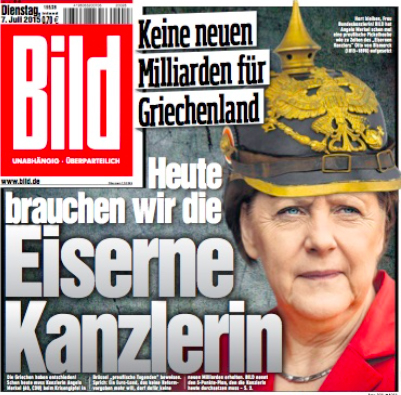 Ganz Europa, so scheint es, und selbst die (mit-)regierenden Sozialdemokraten aus Deutschland, Frankreich und Italien haben sich hinter dem deutschen Schild und dem deutschen Schwert Merkels (CDU) gescharrt, die die Solidarität, das Selbstbestimmungsrecht der Völker und das Friedensgebot der europäischen Union zerschlägt und Europa zum Schlachthaus des Kapitals macht, in dessen Arena die europäischen Völker im heiligen Wettkampf gegeneinander kämpfen, stehen und fallen sollen, damit am Ende die Finanziers unter Applaus von Springer & Co. den Profit einstreichen. Und dabei – wir kennen die Substanzlosigkeit unserer Anästhesistin – läuft seit zwei Wochen dieselbe Kassette der Kanzlerin auf Wiederholung, die sie in Fernsehen und Kameras spricht und die sicherlich nach dem Überstehen dieser Woche für die darauffolgenden zwei Wochen gewechselt wird: die Vorteile überwiegen die Nachteile, also guter Kompromiss (und nun der wirkliche Duktus) für deutsche Interessen, an die die europäischen Interessen unmittelbar verbunden sind.