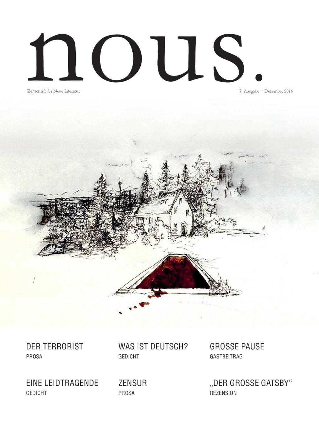 wir freuen uns, euch zum Ende des Jahres die 7. Ausgabe von Nous. vorlegen zu können. Mit der letzten Ausgabe haben wir endlich unsere Grundform, die aus der ganzen vorangegangenen Arbeit hervorgegangen ist, gefunden. Ihr werdet auf Kurzgeschichten, Gedichte, Prosa und Gastbeiträge, sowie eine Rezension stoßen. Den Schriften sind zahlreiche Illustrationen beigelegt, die für sich betrachtet auch einen gewissen Selbstständigkeitscharakter besitzen. Abermals gibt es kein Hauptthema, aber auch keine metaphysische Tabula rasa. Denn auch hier stehen sämtliche Schriften unter einem einheitlichen Zeitkontext, sodass sie sozusagen Kinder ihrer Zeit sind. Insofern werdet ihr den gemeinsamen Tenor der Schriften, die diesmal einen unübersehbaren Realismus-Einschnitt haben, selbst erkennen und formulieren können. Wir denken, dass die Menschen ein immer stärker werdendes Bedürfnis nach einem das Denken stimulierenden Realismus haben – einem aktivistischen Realismus, der soziale Kausalzusammenhänge freilegen soll, um gesellschaftliche Ursachen und folgenschwere Triebkräfte sichtbar zu machen, durch die wir heute wie Murmeln in einer Glasschale hin und her geschleudert werden.