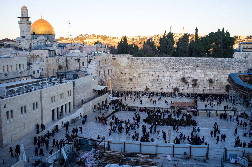 In vollkommener Dunkelheit schreiten wir durch das Jaffator hinter die dicken Kalksteinmauern der Jerusalemer Altstadt. Hier tummeln sich sonst geschäftige Anwohner und unzählige Touristengruppen, die dort ihre Führung durch die verwinkelten und verzweigten Viertel beginnen. Doch um diese Zeit herrscht hier vollkommene Stille. Aus einiger Entfernung hört man lediglich ein paar Wachmänner murmeln, von Zeit zu Zeit fährt ein Auto oder ein Orthodoxer auf seinem Golfcart vorbei. Die leergefegten Straßen wirken beinahe gespenstisch. Völlig planlos gehen wir entlang der Innenseite der Stadtmauern zum Zionstor und dann weiter, bis wir einen gut ausgeleuchteten Platz entdecken, über den in schwarze Mäntel gehüllte Gestalten huschen, um kurz die riesige Mauer, auf die hier alles abzuzielen scheint, zu berühren und dann in die links danebenliegenden Gemäuer zu verschwinden. Wir sind nun an der Ostseite der Altstadt. Dort steht die berühmte Klagemauer, neben der Heiligen Schrift selbst das größte Heiligtum der Juden. Sie ist der letzte Überrest des zweiten Tempels, der nach seiner Umgestaltung durch König Herodes des Großen im Zuge des römisch-jüdischen Krieges im Jahre 70 zerstört wurde. Und ungünstiger Weise ist sie nun nicht nur Ankerpunkt der jüdischen Sehnsucht nach ihrem Tempel, dessen Überreste um sie herum zu suchen wären, sondern sie ist auch Stützmauer des religiösen Zentrums der muslimischen Gemeinschaft in Jerusalem – dem „al-haram asch-scharif“, dem „edlen Heiligtum“ von dem aus Mohammed seine Himmelfahrt angetreten haben soll – von Israelis und Touristen Tempelberg genannt. Doch bis es Touristen um sieben Uhr morgens erlaubt ist, für einige Stunden das Hochplateau zu beschreiten, auf dem die „qubbat as-sachra“, der Felsendom, und die al-Aqsa-Moschee stehen, bleibt noch einige Zeit, um an die Klagemauer heran zu treten. Der Zugang zu ihr war Juden zwischen dem Unabhängigkeitskrieg 1948 bis zum Sechs-Tage-Krieg 1967 nicht möglich, da dieser Teil der Altstadt von Jordanien kontrolliert wurde. Seitdem wird hier nicht nur rund um die Uhr gebetet, sondern es werden auch Soldaten und Soldatinnen eingeschworen. Männer sind für drei Jahre, Frauen für 21 Monate verpflichtet, in den „Israeli Defense Forces“ zu dienen.