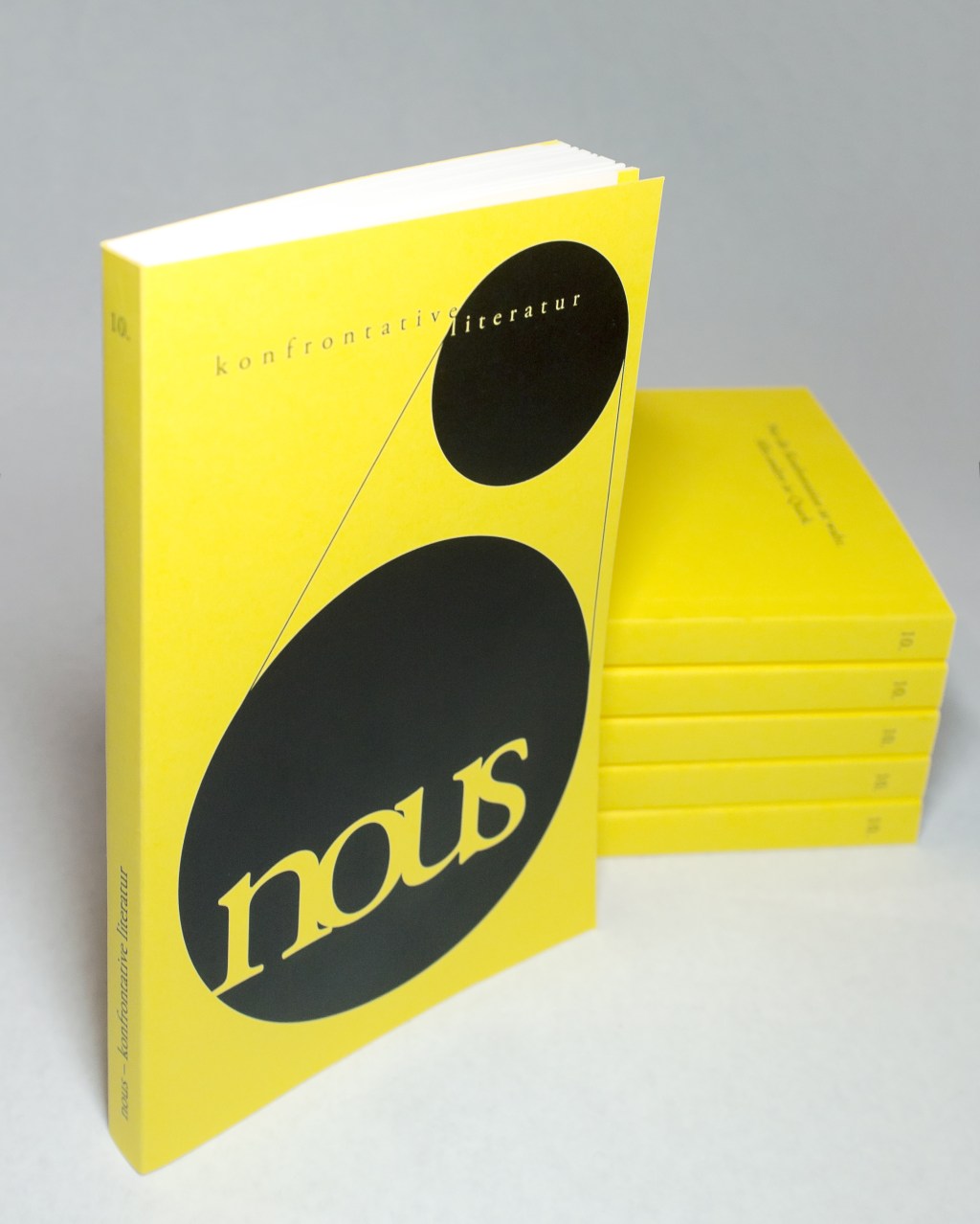 Die 10. Ausgabe ist fertig. Ab sofort ist sie bei uns im shop, als auch über alle teilnehmenden Buchhandlungen erhältlich. Das knapp zweihundert seitige Taschenbuch beinhaltet Erzählungen, Gedichte, einen lyrischen Gastbeitrag, ein Essay und sechs Illustrationen. Es beinhaltet konfrontative Kunst und Literatur. Bei Interesse an Rezensionsexemplaren schreibt uns eine Mail an: nous@freenet.de