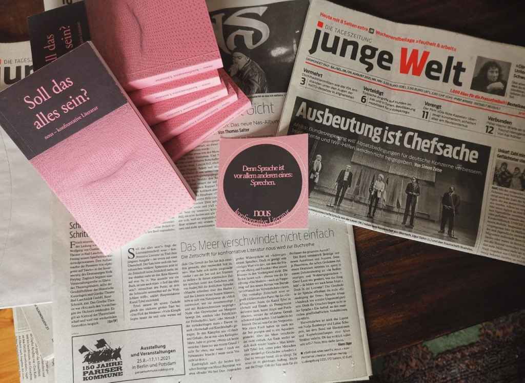 „»Soll das alles sein?« fragt die Literaturzeitschrift nous – konfrontative #Literatur im Titel ihrer jüngsten Ausgabe – der ersten mit einer Überschrift. Der Satz hätte auch ein Ausrufezeichen verdient: Spätestens jetzt ist die Zeitschrift keine Zeitschrift mehr, sie war ohnehin mehr als das. Kein Hinweis auf eine Nr. 11 Was aussieht wie ein Buch, ist nun auch eines. ‚»Soll das alles sein?« verzeichnet den Punkt, an dem die Sehnsucht unversöhnt auf die Wirklichkeit trifft‘, erklärt Kamil Tybel einleitend. (…) Ob das wirklich »alles sein soll«? Nein, bitte mehr davon.“ – Glenn Jäger in junge Welt (jW) vom 28.08.2021
