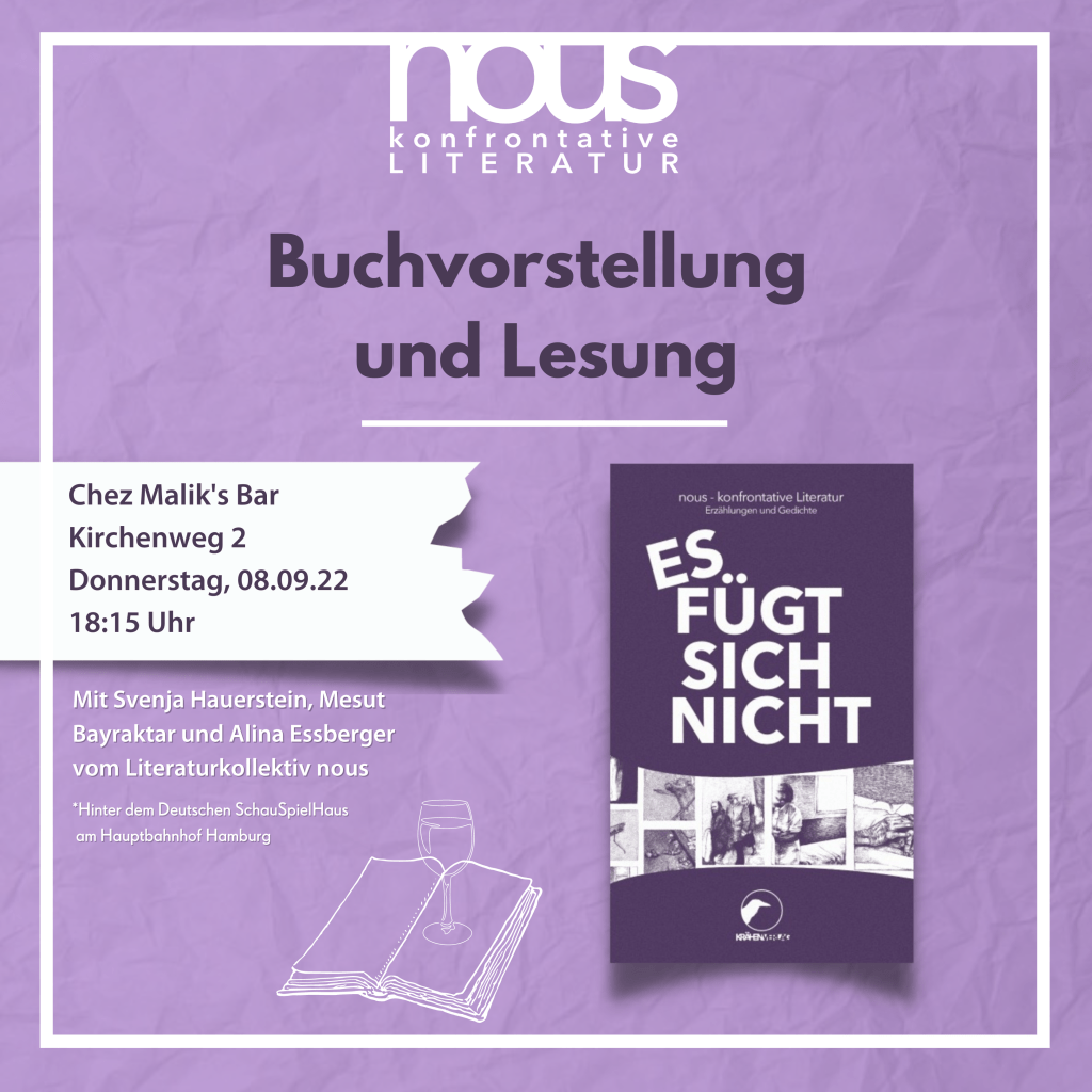 Die Veröffentlichung unseres Taschenbuchs »Es fügt sich nicht« ist ein paar Wochen her. Wir laden euch zu unserer Buchvorstellung mit Lesung in Chez Maliks Bar in Hamburg ein!