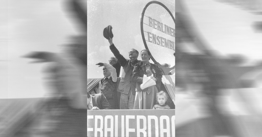 Selten sieht man den marxistischen Dichter so gelassen und erfüllt. Bertolt Brecht steigt in einen Festwagen, neben ihm die Schauspielerin und Weggefährtin Helene Weigel. Unmittelbar hinter ihnen ist überdimensional das kreisrunde Signet des Berliner Ensembles, das sich heute als Leuchtreklame auf der Turmspitze des Theaters am Schiffbauerdamm dreht. Vor wenigen Monaten übernahmen sie und ihre Mitarbeiter die Leitung des Theaters. Brecht trägt ein abgewetztes Hemd, bis zum Hals zugeknöpft und mit breiten Taschen an den Seiten. Die rechte ist offenbar von einem Gegenstand beschwert. Mit einer Schiebermütze in der Hand hebt er den rechten Arm zum Gruss. Unter seinem dünnen Schnurrbart zeichnet sich ein Lächeln ab, bei Weigel ist es unübersehbar.
